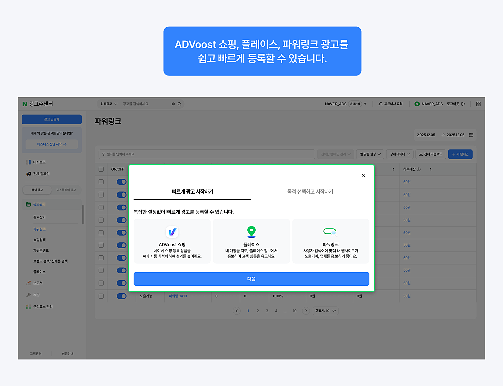 • 파워링크, ADVOOST 쇼핑, 플레이스 광고를 빠르게 등록할 수 있습니다.