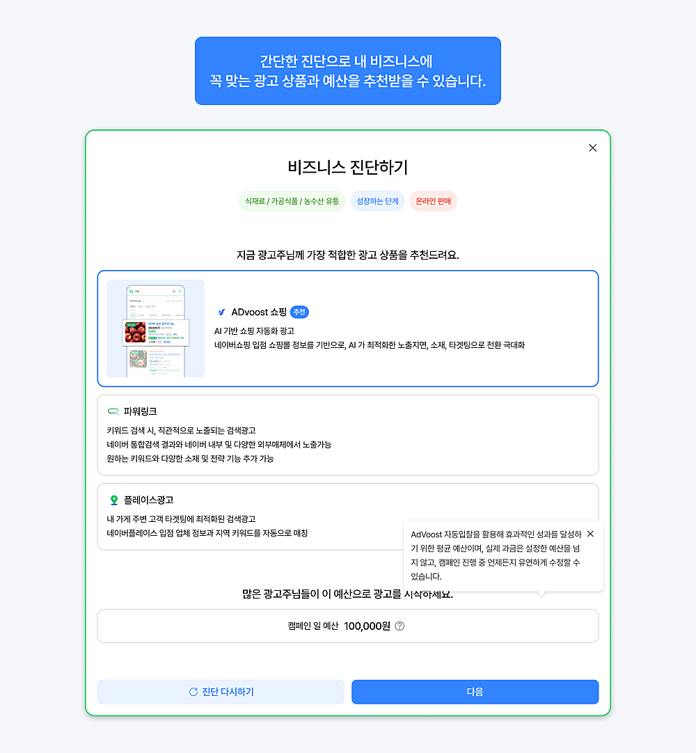 • 업종, 사업 성장 단계, 광고 목적을 기반으로 적합한 광고 상품과 예산을 추천합니다.