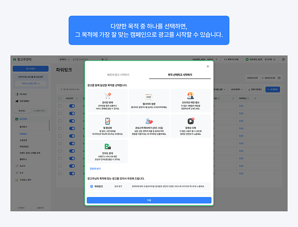 선택한 광고 목적에 따라 네이버 광고에서 집행 가능한 캠페인을 보여주며, 광고를 등록할 수 있습니다.
