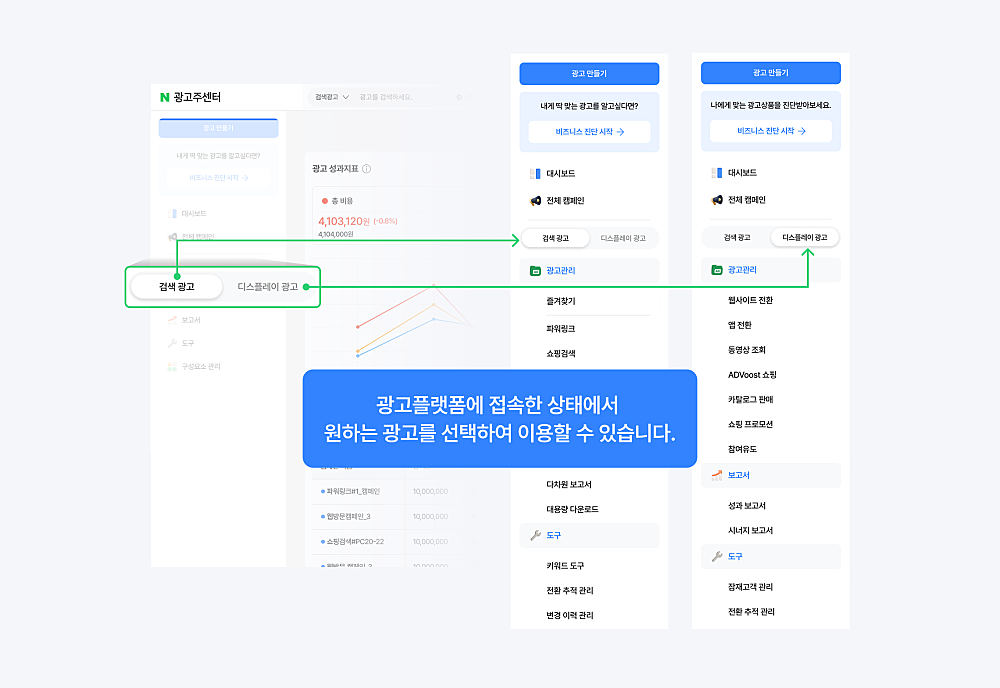 이전에는 검색광고 계정은 검색광고 플랫폼, 성과형 디스플레이 광고계정은 해당 플랫폼만 접속할 수 있었으나, 이제는 각 광고계정으로 두 플랫폼 모두 이용하실 수 있습니다.