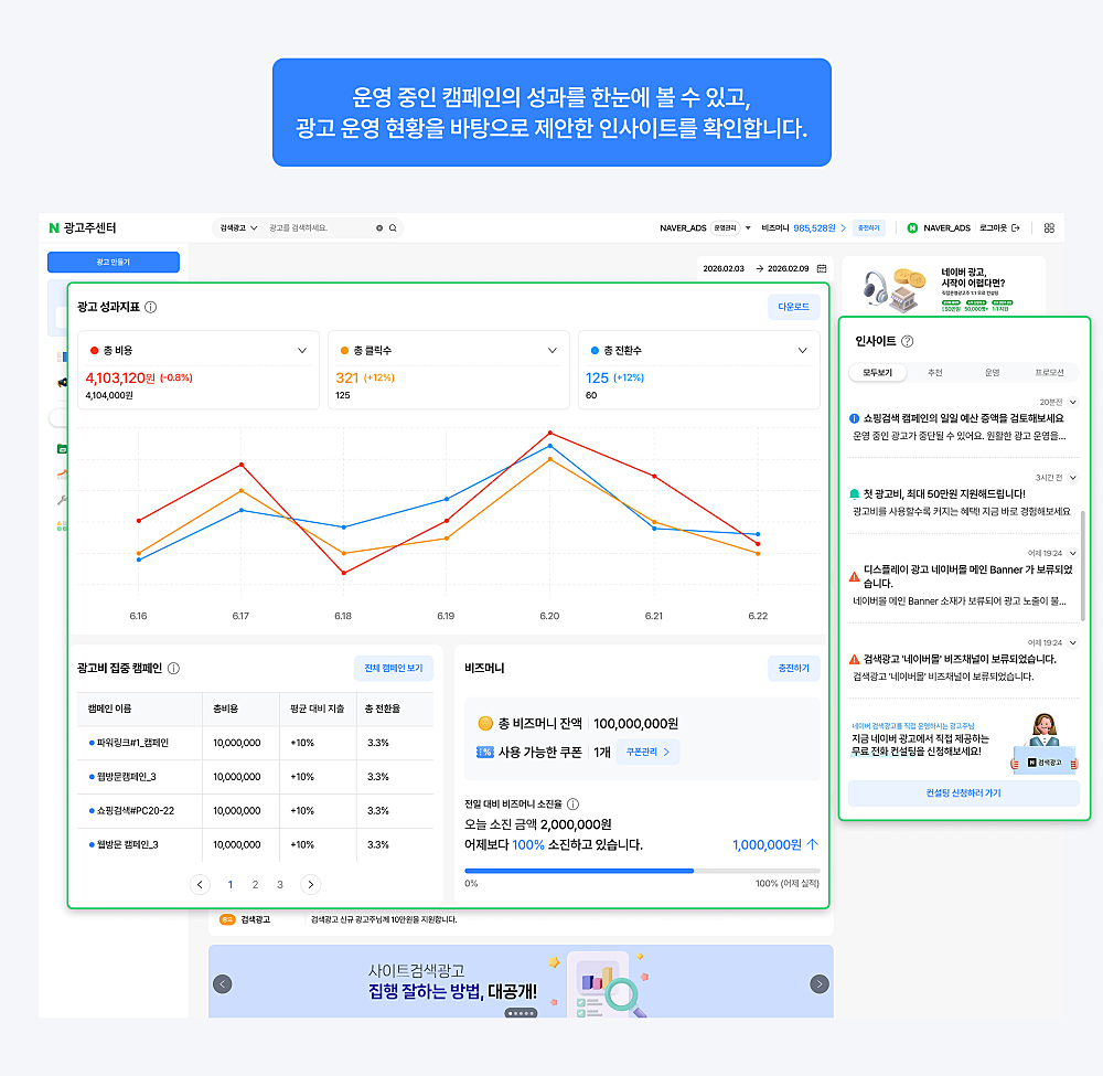 • 캠페인 성과 변화와 광고비 소진 현황을 직관적으로 확인할 수 있습니다.