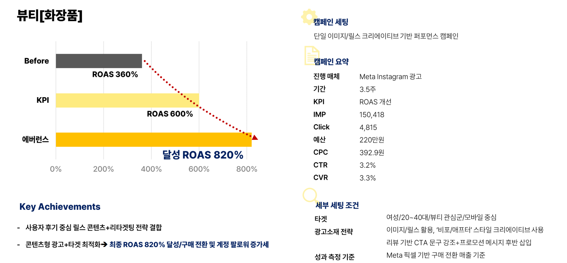 CTR, 노출 수, A/B 테스트, 전환데이터 실시간 분석 후 ROAS 지속적 개선